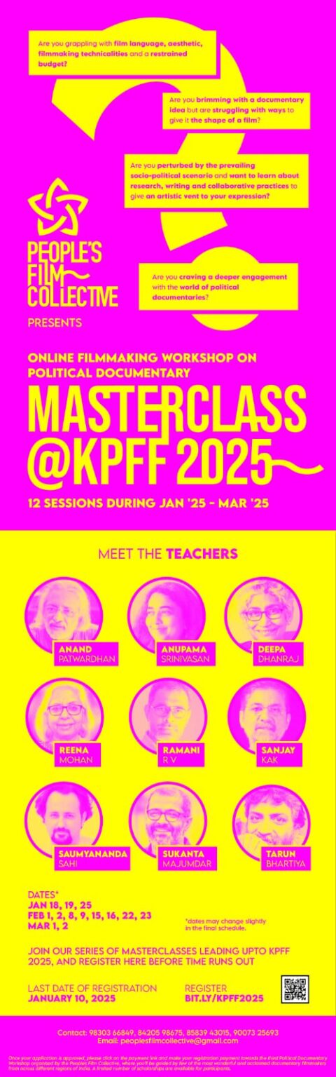 People’s Film Collective presents MASTERCLASS@ KPFF 2025 Online Film-making Workshop on Political Documentary 12 Masterclasses during Jan ’25 – Mar […]