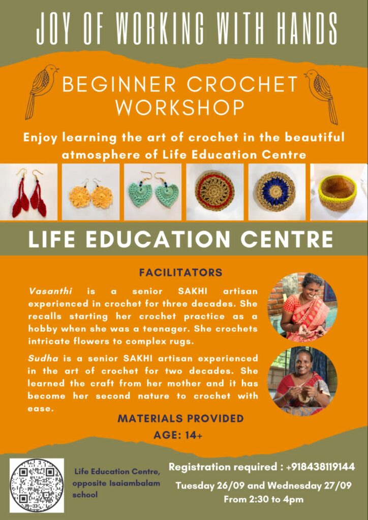 Meet our experienced facilitators: Vasanthi, a seasoned SAKHI artisan with 30 years of crochet experience, and Sudha, skilled with 20 years of crochet knowledge.