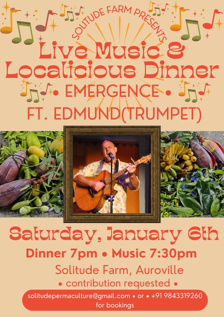 Experience Jade EMERGENCE Live: Join us at Solitude Farm, Auroville, for an enchanting evening with Jade EMERGENCE, featuring the talented Edmund on trumpet, on Saturday, January 5th.