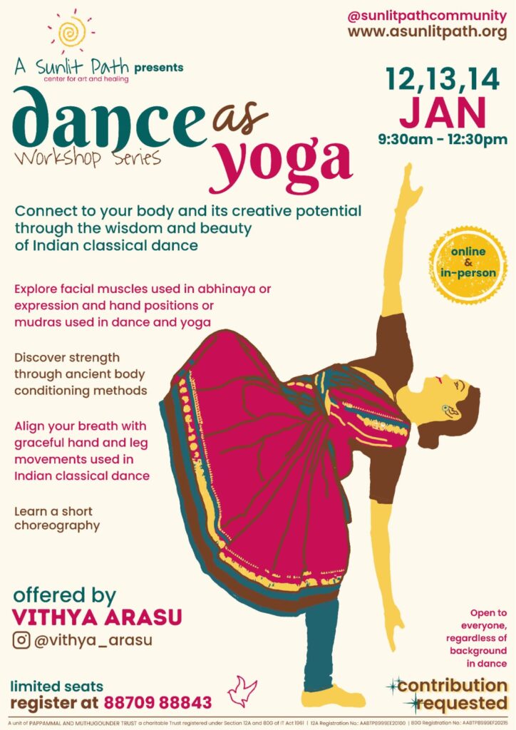 We are thrilled to bring back Vithya Arasu @vithya_arasu for another “Dance as Yoga” workshop series at A Sunlit Path on January 12-14, 2023 from 9:30am to 12:30pm. Join us and feel the beauty of Indian classical dance in your body and the sheer joy and elevation it can bring through its rich expression.