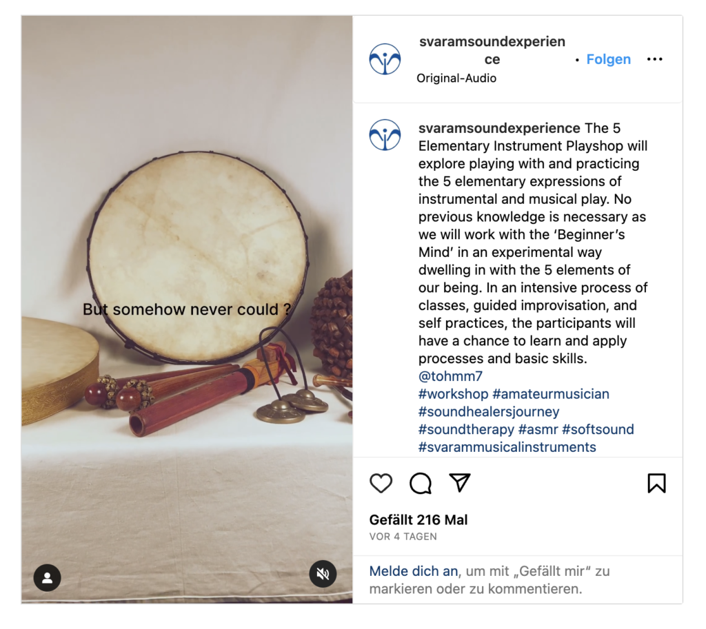 The 5 Elementary Instrument Playshop will explore playing with and practicing the 5 elementary expressions of instrumental and musical play. No previous knowledge is necessary as we will work with the ‘Beginner’s Mind’ in an experimental way dwelling in with the 5 elements of our being. In an intensive process of classes, guided improvisation, and self practices, the participants will have a chance to learn and apply processes and basic skills.