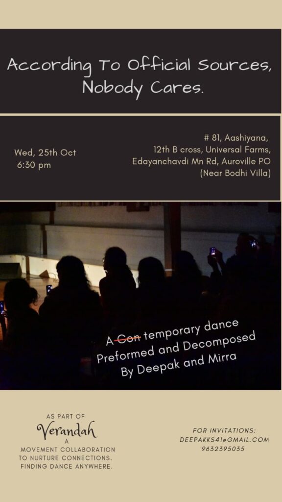 Event Date: Wednesday, October 25th Time: 6:30 PM Location: #81, Aashiyana, 12th B Cross, Universal Farms, Edayanchavdi Mn Rd, Auroville PO (Near Bodhi Villa) For Invitations: Contact Deepak at deepakks41@gmail.com or call 9632395035.