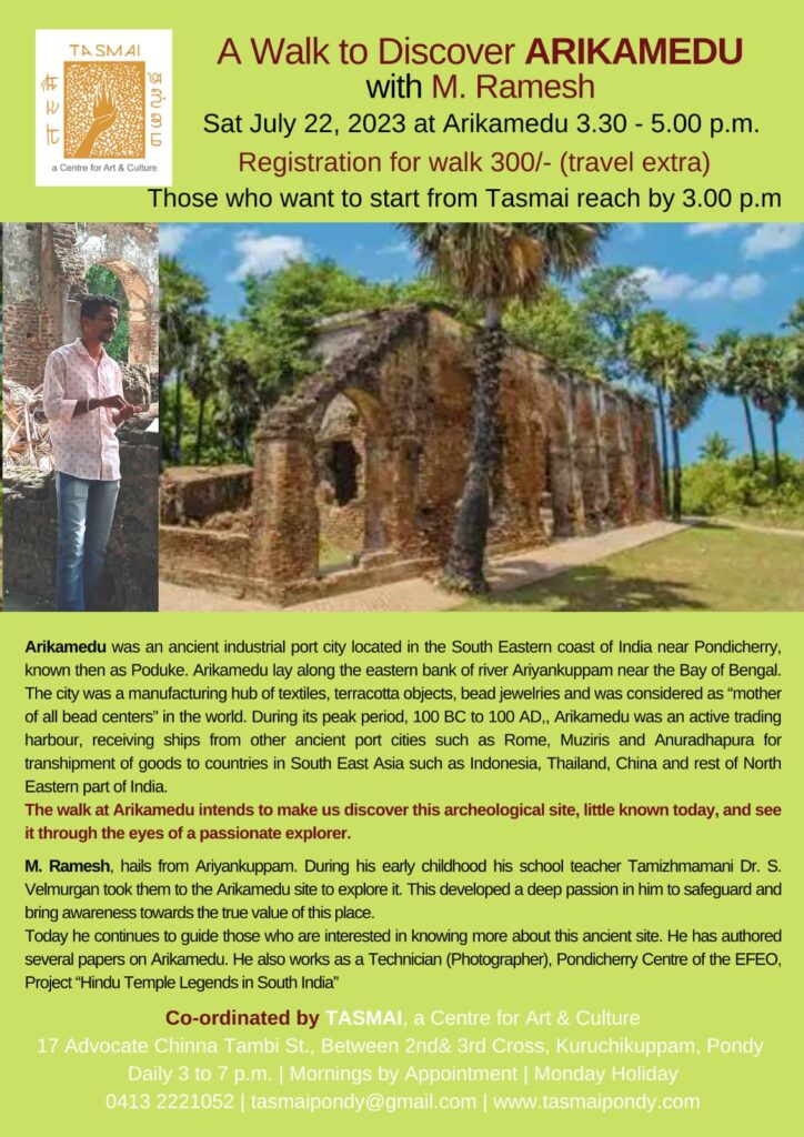 M. Ramesh, hails from Ariyankuppam. During his early childhood his school teacher Tamizhmamani Dr. S Velmurgan took them to the Arikamedu site to explore it. This developed a deep passion in him to safeguard and bring awareness towards the true value of this place