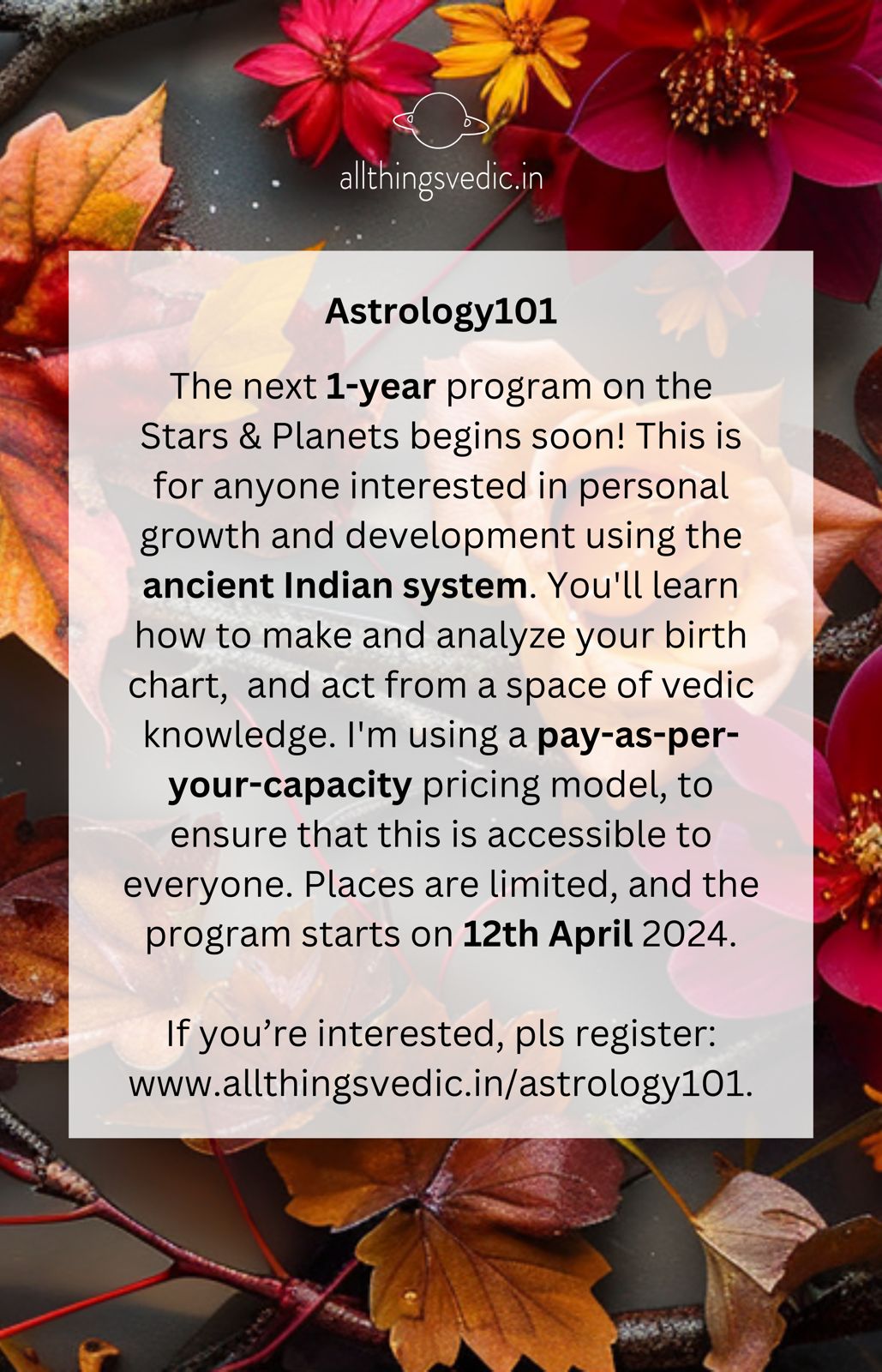 The next 1-year program on the Stars & Planets begins soon! This is for anyone interested in personal growth and development using the ancient Indian system. You’ll learn how to make and analyze your birth chart, and act from a space of vedic knowledge. I’m using a pay-as-per-your-capacity pricing model, to ensure that this is accessible to everyone. Places are limited, and the program starts on 12th April 2024.