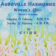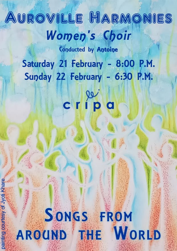 You are kindly invited to the coming performance of the women’s choir Auroville Harmonies Saturday 21/02 8pm or Sunday 22/02 6:30pm in Cripa