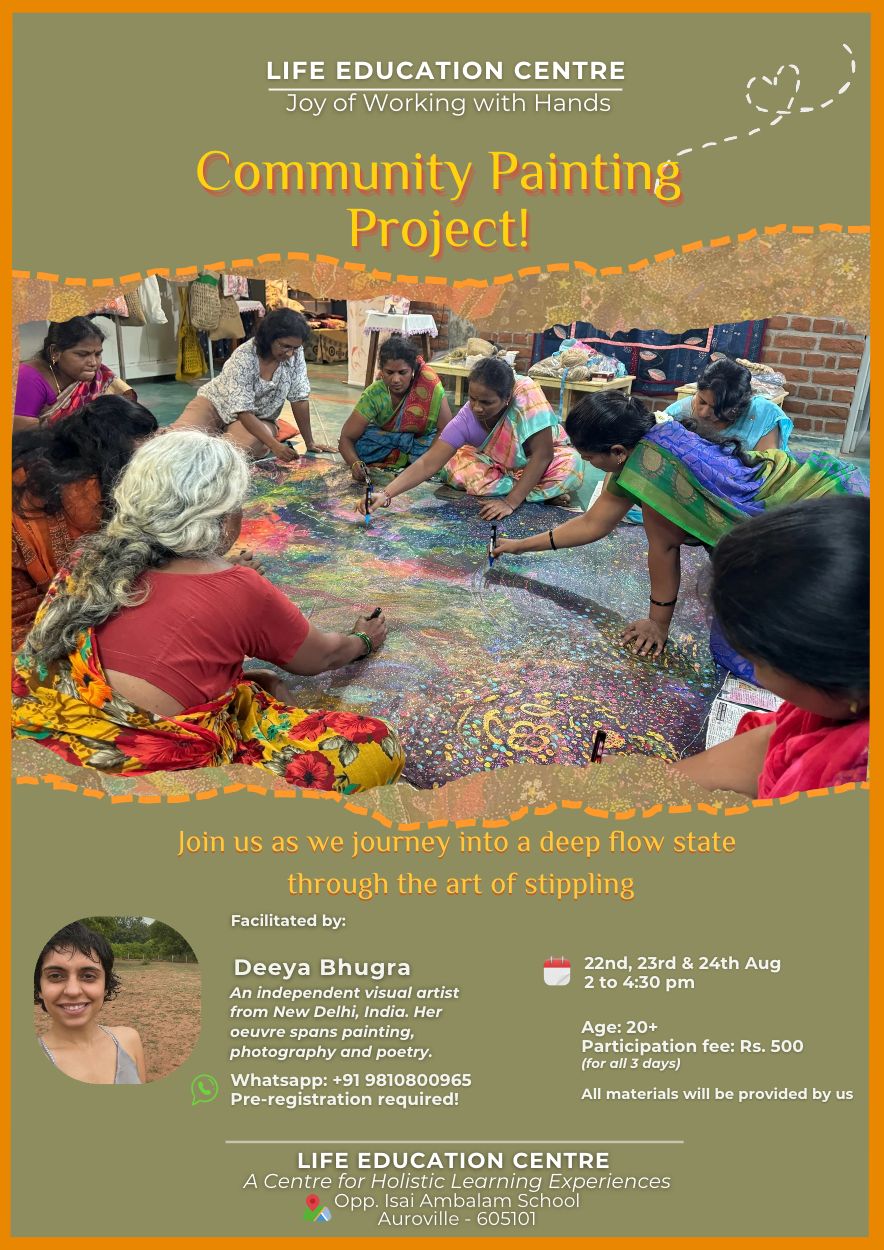 Co-create a large-scaled acrylic painting using stippling – a technique of repetitive dot-making with paint markers. Experience the deep silence and expansiveness as the mind quietens.