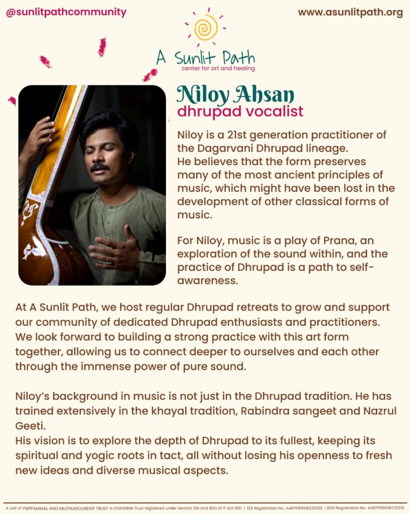 Join us for another dip into the ocean of Dhrupad with Niloy Ahsan at A Sunlit Path, Auroville on Dec 1, 2 & 3. Journey with us into stillness through sound.
