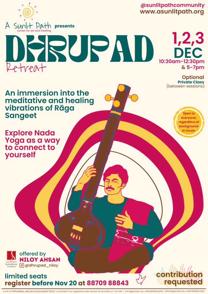 Join us for another dip into the ocean of Dhrupad with Niloy Ahsan at A Sunlit Path, Auroville on Dec 1, 2 & 3. Journey with us into stillness through sound.