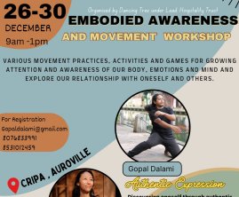 Join us for ‘Embodied Awareness / Movement’ 🌿 5 day retreat for various workshops centred around growing awareness of our emotional, physical, mental and subtle bodies. 🌸 We will discover through the tools of authentic expression, working with prana and breath, poetry, somatics and journalling as we explore the relations to oneself, others and surroundings in a embodied way through the senses. 🌟 Register for the 5 days via WhatsApp on +91 88009 29496 🦋. Limited spots available .