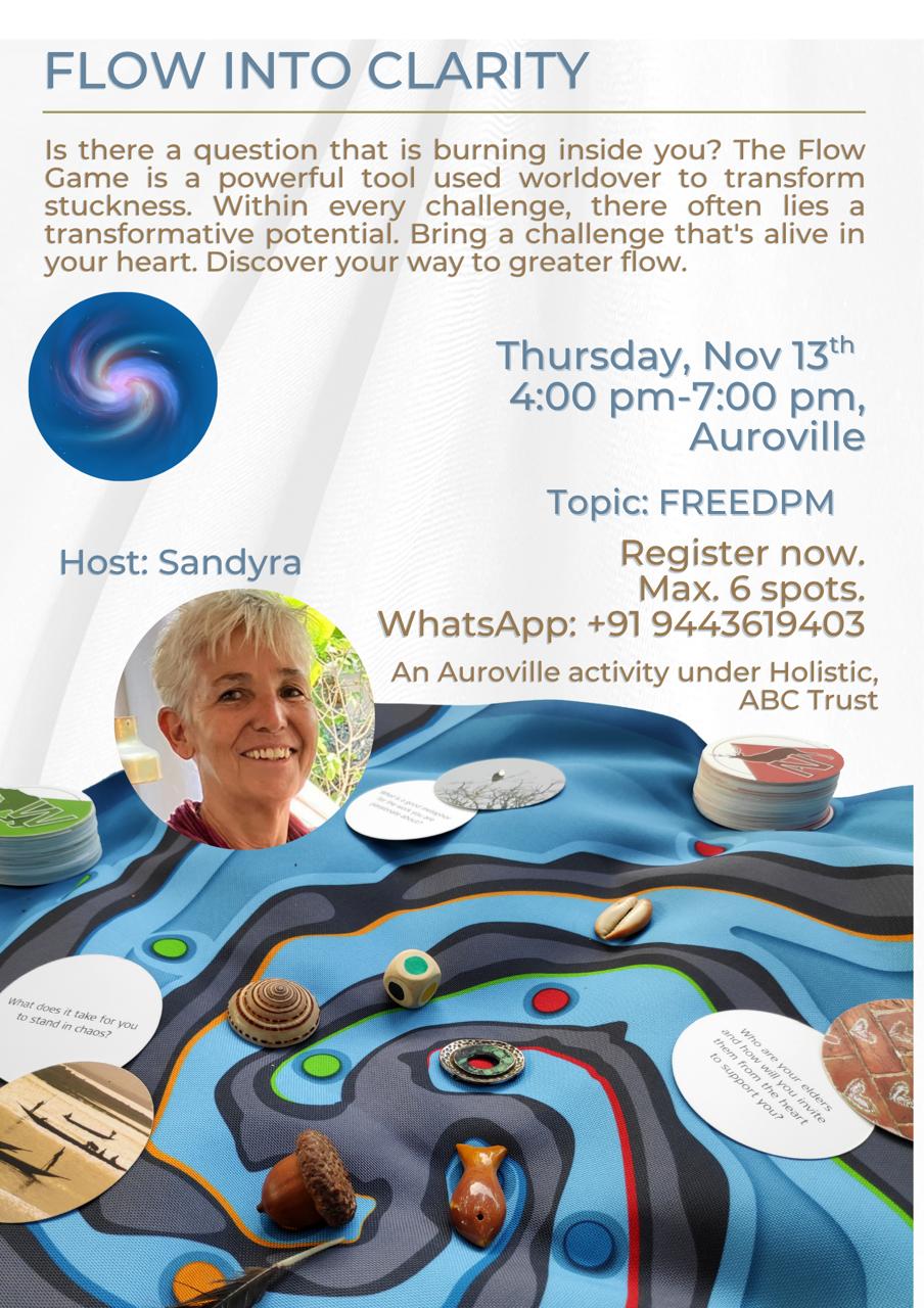 Is there a burning question alive in your heart? The Flow Game is a powerful tool to get transformational insights using higher guidance and collective wisdom with ease and joy. Next Flow Game in Auroville will be on Thursday , Nov 13th, 4-7pm Sign up quickly! Limited seats! 🪷: The overarching topic will be: – FREEDOM Registration: What’s app: ‪+91 944 3619 403‬ or contact@jiva-auroville.com More infos: https://auroville-jiva.com/flow-into-alignment/ Or https://auroville-jiva.com