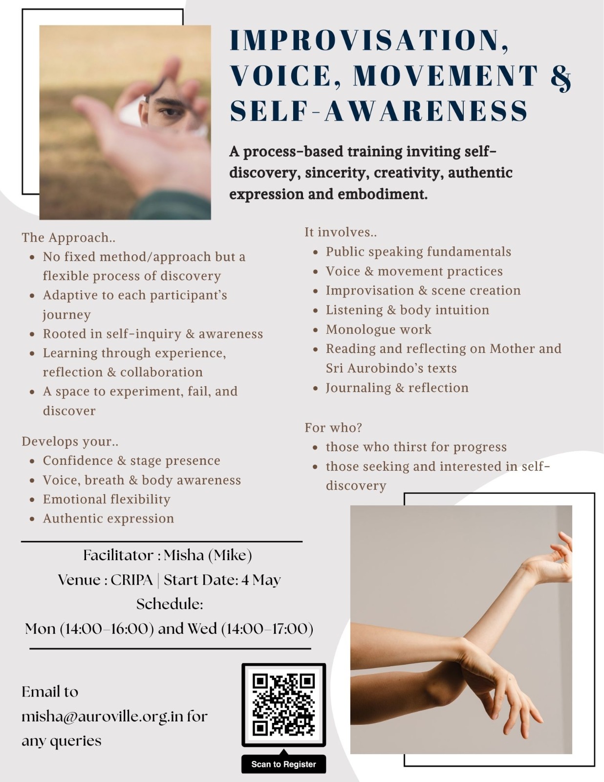Please fill this form to register https://forms.gle/aVVwMzykwng4RuJK7 and for queries email misha@auroville.org.in