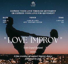 LOVE IMPROV Gopal Dalami Feb 14th | 4 to 6pm express your love through movement or express your love for movement a fun evening of contact improv dance followed by jam 4 to 5pm: Improv class (Rs 300) 5pm onwards: Improv jam (Rs 200) 4 to 6pm: Improv class + Jam (Rs 400) Limited spots! RSVP +91 88009 29496