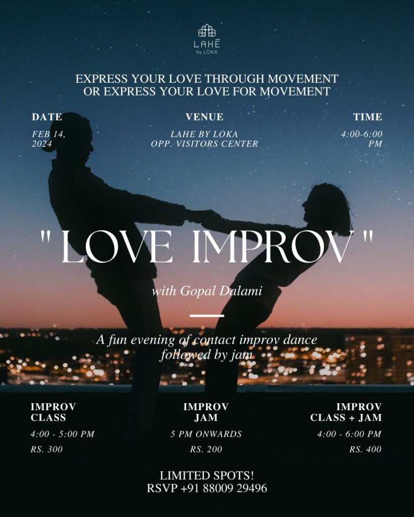 LOVE IMPROV Gopal Dalami Feb 14th | 4 to 6pm express your love through movement or express your love for movement a fun evening of contact improv dance followed by jam 4 to 5pm: Improv class (Rs 300) 5pm onwards: Improv jam (Rs 200) 4 to 6pm: Improv class + Jam (Rs 400) Limited spots! RSVP +91 88009 29496