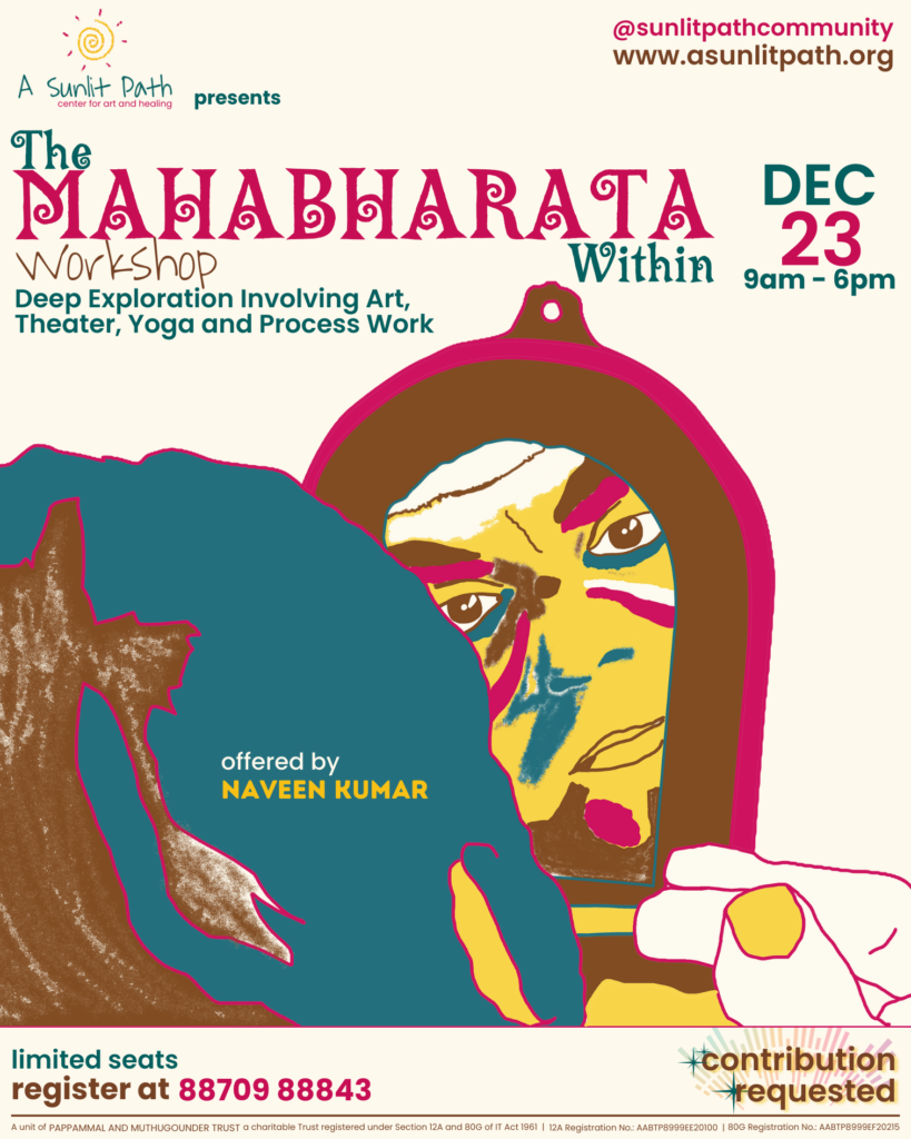 Join us for a self-reflective exploration of your inner world using the Mahäbhärata as a mirror. This workshop, facilitated by Naveen Kumar, is a deep exploration that uses Art, Theater, Yoga and Process work.