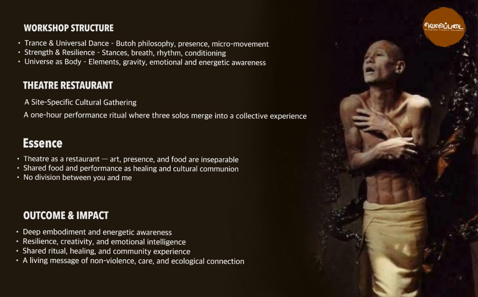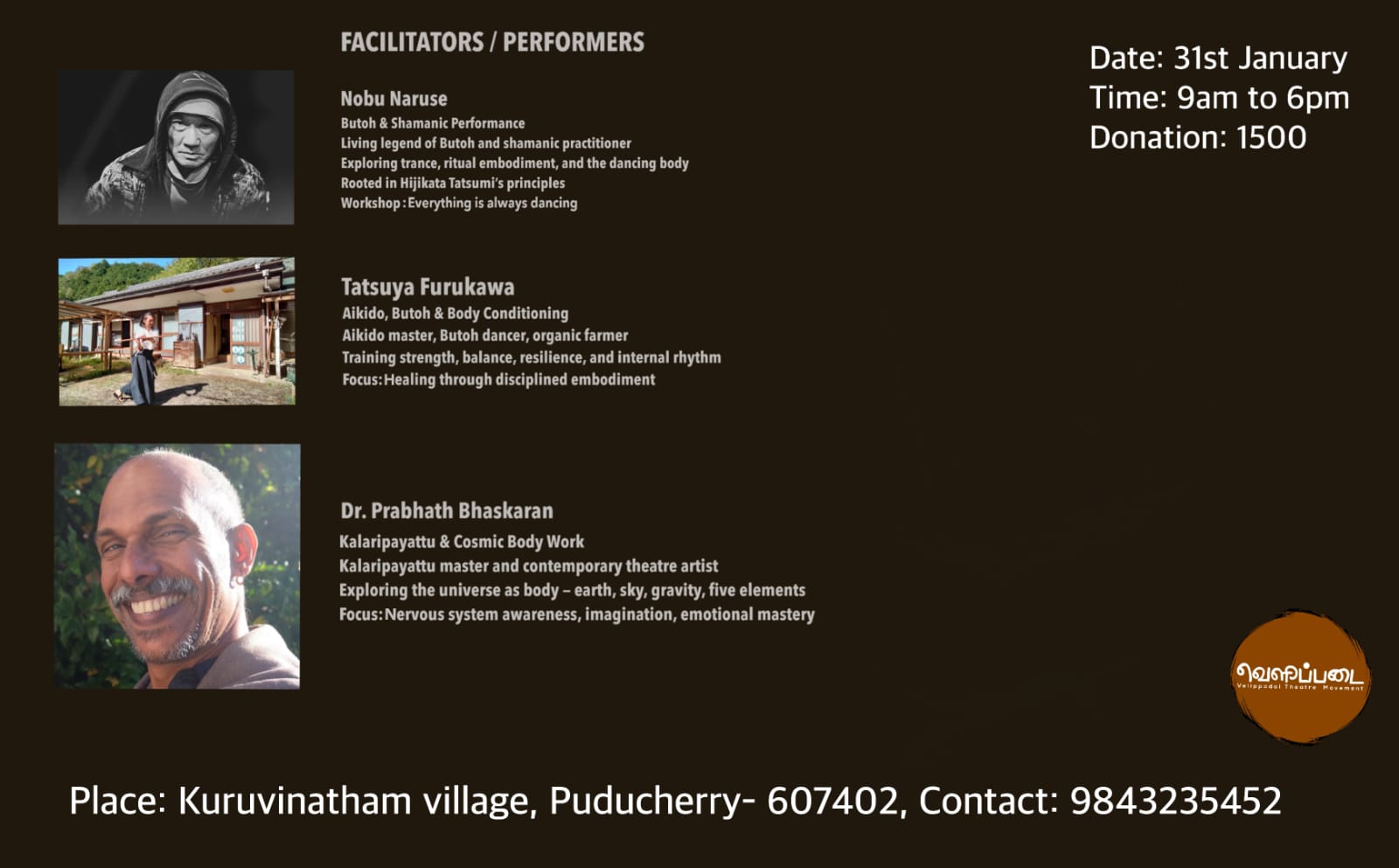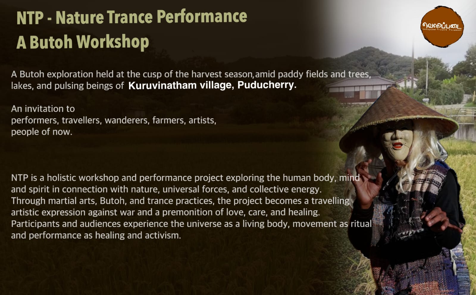 NTP is a holistic workshop and performance project exploring body, mind, and spirit through nature, universal forces, and collective energy, using martial arts, Butoh, and trance practices to create a traveling artistic expression against war where movement becomes ritual and performance becomes healing, love, care, and activism. The workshop is conducted by three great masters from Japan: Nobu Naruse (Butoh & Shamanic Performance), Tatsuya Furukawa (Aikido, Butoh & Body Conditioning), and Dr. Prabhath Bhaskaran (Kalaripayattu & Cosmic Body Work), focusing on embodied practice, strength, and the universe as body. It is a workshop-cum-performance where the three facilitators perform solos that merge into a collective expression.