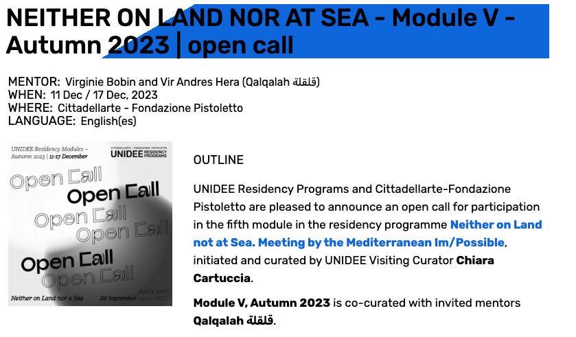 UNIDEE Residency Programs | NEITHER ON LAND NOR AT SEA – Module V – Autumn 2023 | open call (cittadellarte.it)