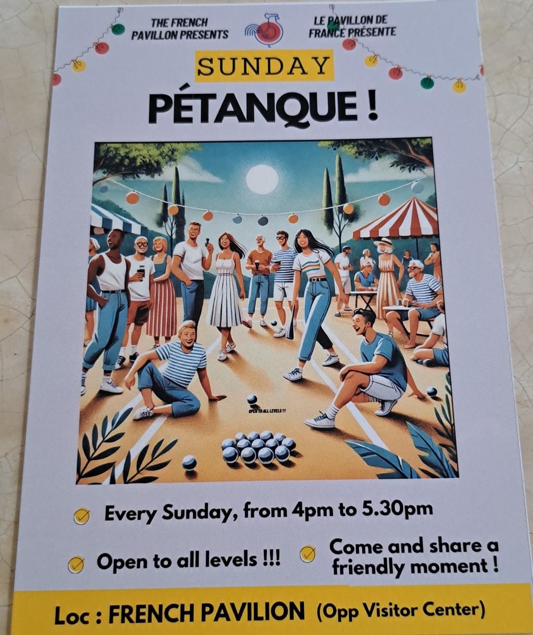 The French Pavillon organizes a petanque event every Sunday, Starting this week, from 4pm to 5:30pm. Open to All levels. Come and share a friendly moment.