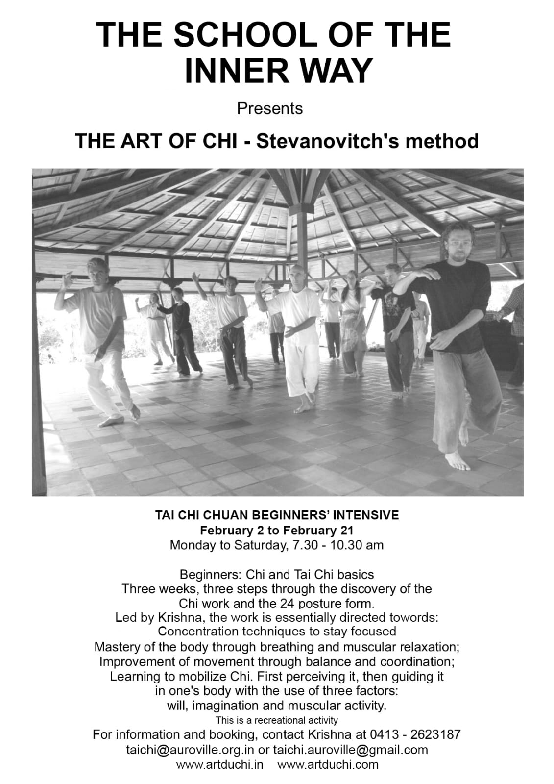 This three-week intensive is designed for beginners and follows three steps through the discovery of Chi work and the 24 posture form. Led by Krishna, the course is primarily directed towards: