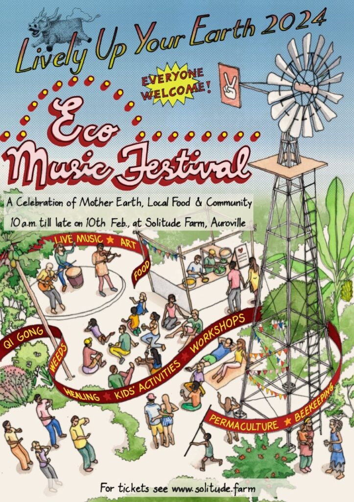 Preparations for Lively Up Your Earth, Eco-music Festival at Solitude Farm are well under way! There is still space for stalls, workshops, slots for bands and other performance art. We are looking for volunteers to help manage the Kids’ Space. In the early evening of the festival there will be a moment where we will have a collective journey through meditation, singing, dance, and movement. We are looking for someone to facilitate a Qi Gong circle as we have had in the past. We are also looking for volunteers to help manage the local food stalls and to help run the event. Any ideas you have are very welcome. Reach out to us if you have any inspired ideas @Solitude Farm Cafe +91 8072053484