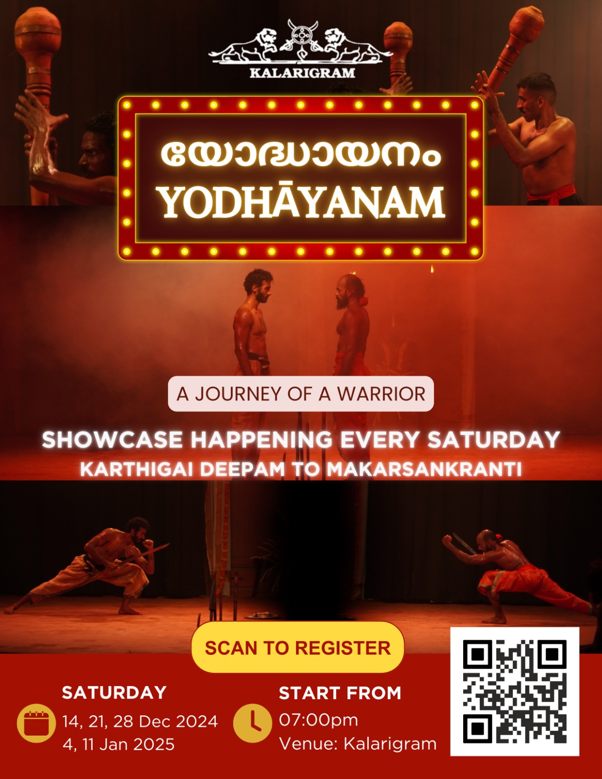 Join us for Yodhayanam – The Journey of a Warrior, a performance celebrating the spirit of Kalari Today, 7 PM at Kalarigram – don’t miss it!